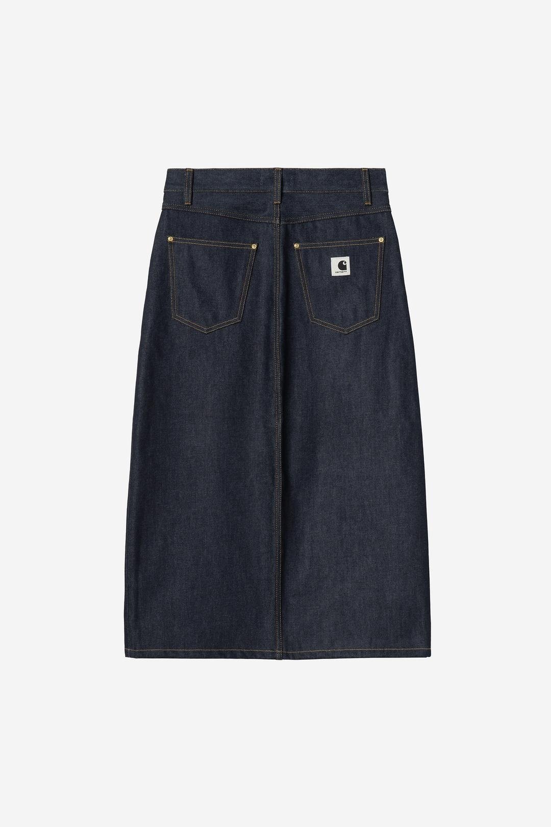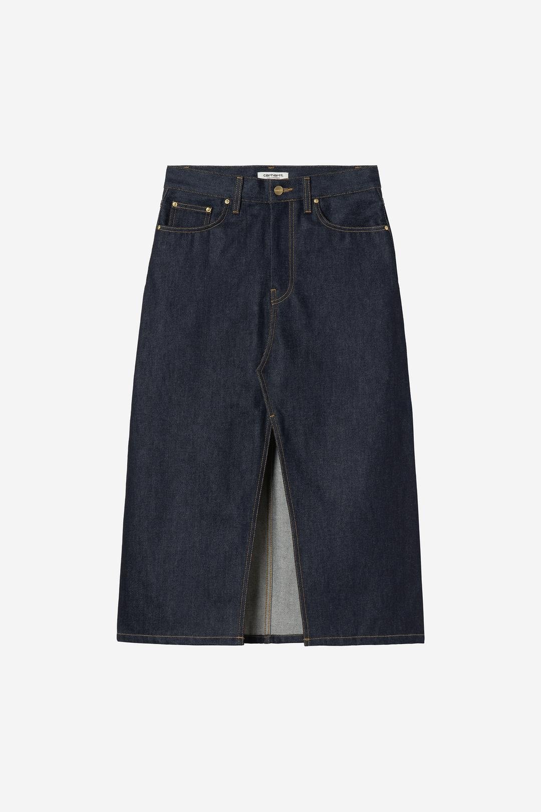 Realizzata in pesante denim di cotone e caratterizzata da vestibilità comoda. Basata su un modello jeans a cinque tasche, la gonna presenta sprone posteriore e spacco sul davanti. Ulteriori elementi funzionali sono l’impuntura a travetta e i rivetti in metallo nei punti di maggior usura. Il design è impreziosito da un’etichetta quadrata in tessuto.